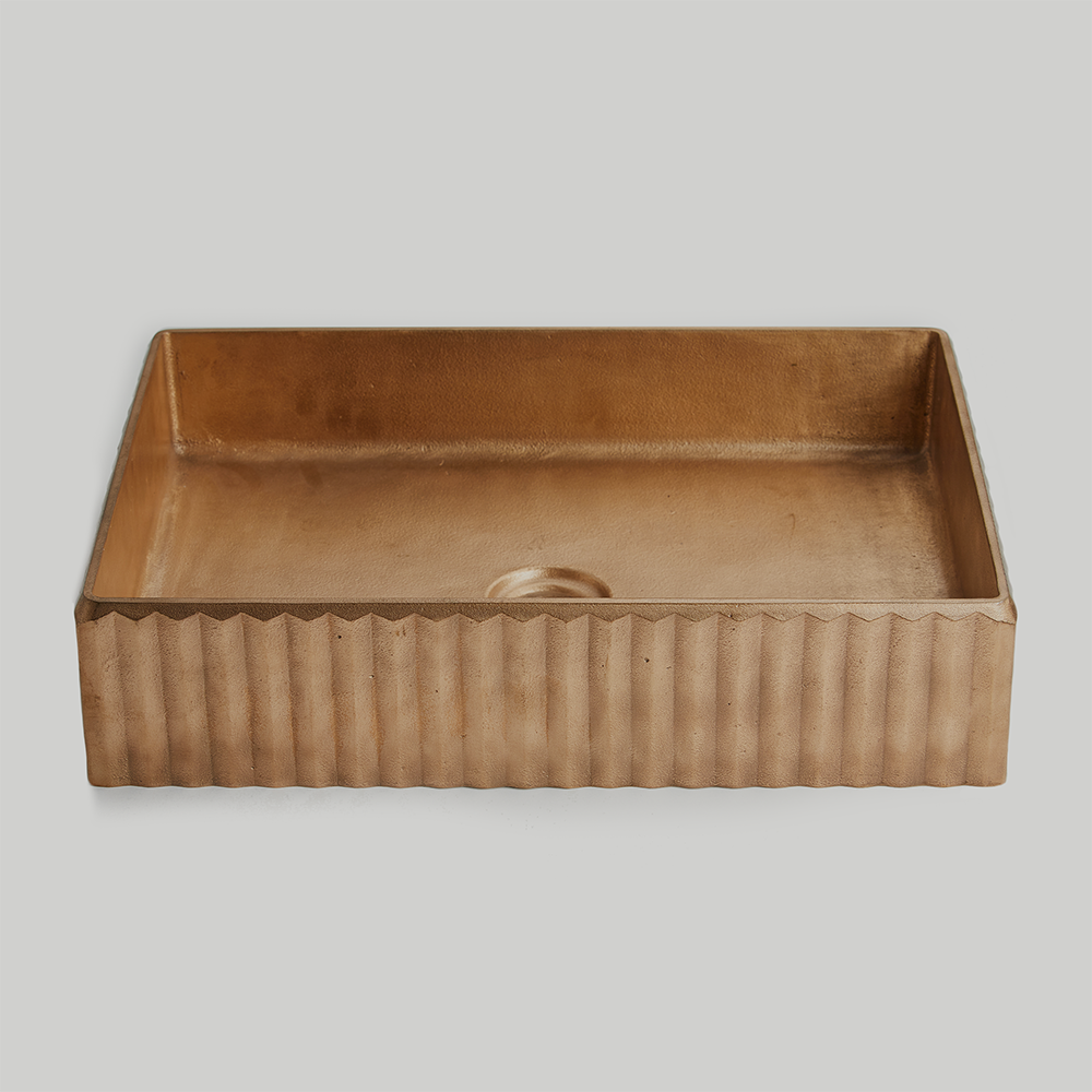 Raw, refined, beautiful, luxurious, indulgent, solid and forever. The V shaped fluting around the basins was inspired by a series of bridges located in the eastern suburbs of Melbourne. Each piece is lightly buffed smooth, but not polished, allowing the gritty sand marks, imperfections and variations obtained during the casting process to be seen and celebrated— giving each item its uniquity.
